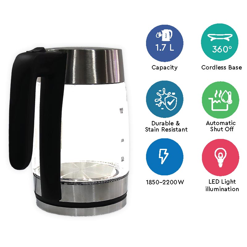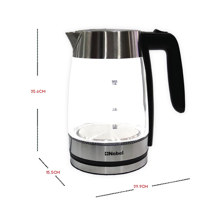 Nobel Kettles Transparent 1.8 Litre Led Light Stainless Steel Heating Element Boiling Dry Protection Auto Shutoff NK180G